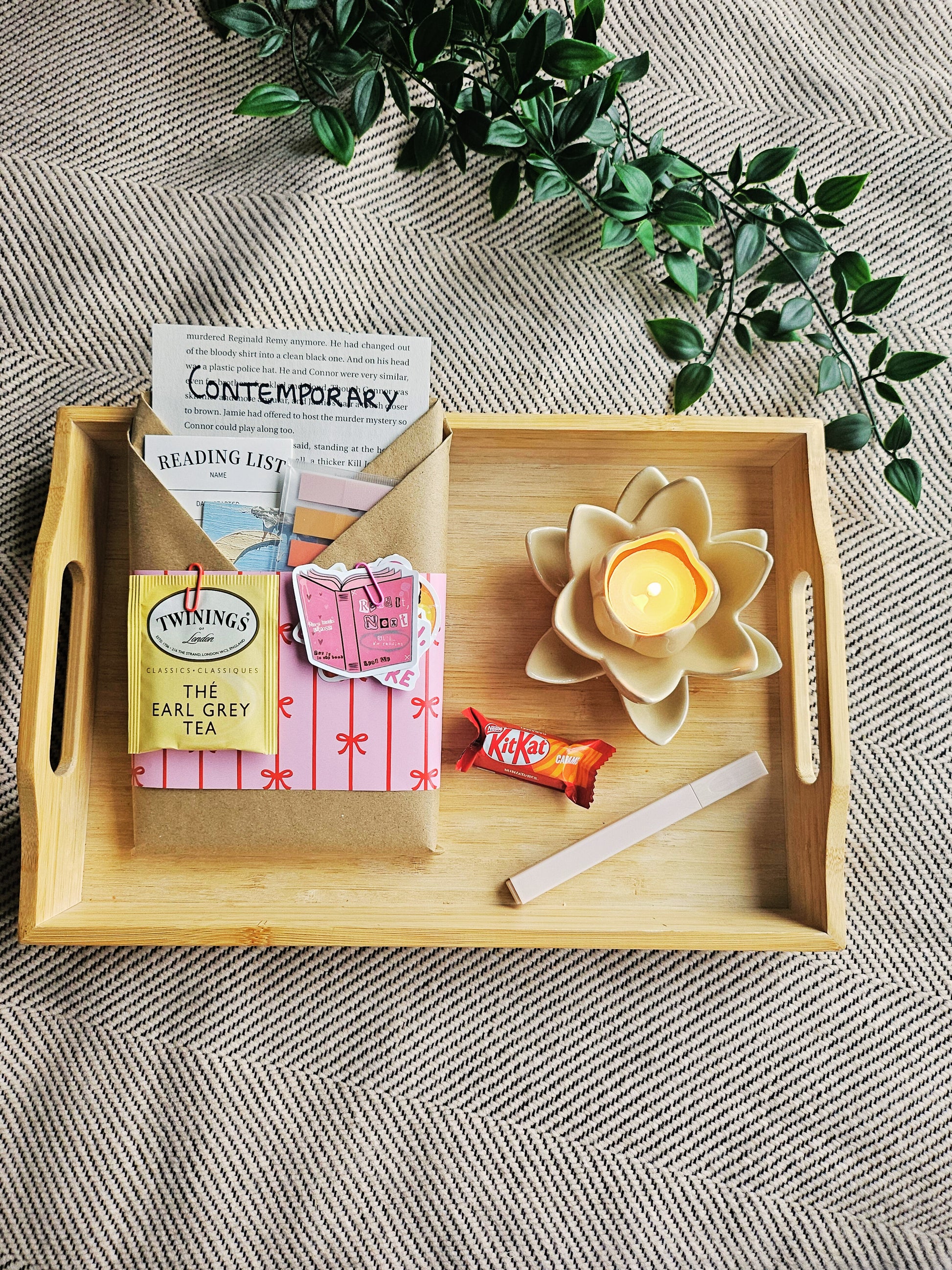 What's included: A book, 1 bookmark, 1 review page, 4 bookish stickers, a highlighter, beverage of your choice, a sweet treat, and annotation tabs.